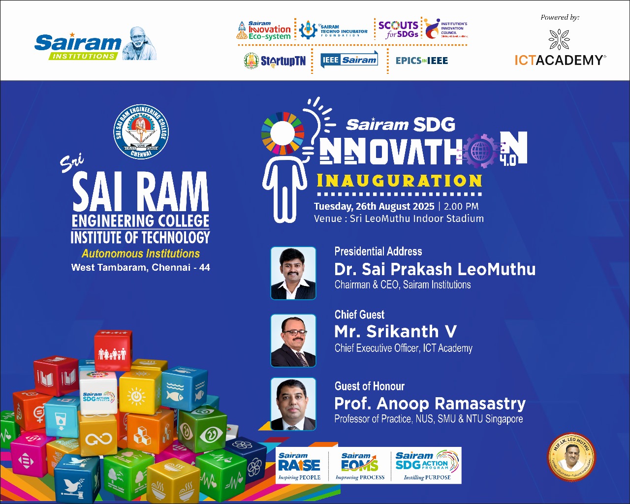 Sairam SDG Innovathon 4.0 was inaugurated on 21st July 2025 at Sri Sairam Engineering College as part of the institution’s flagship innovation initiatives. This third edition continues the mission of enabling third – year students to design and develop impactful, real-world solutions aligned with the United Nations Sustainable Development Goals (SDGs).